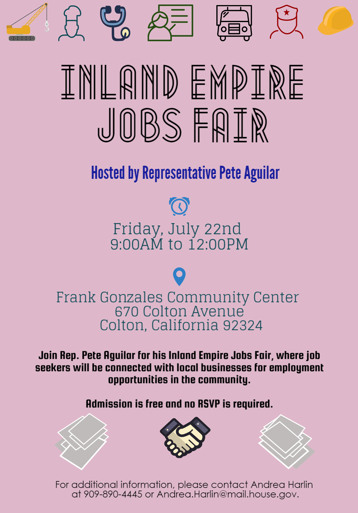 United StatesJoin Rep. Pete Aguilar for his Inland Empire Jobs Fair on Friday, July 22nd from 9:00AM to 12:00PM at the Frank Gonzales Community Center in Colton, California. Job seekers will be directly connected with Inland Empire employers looking to hire.